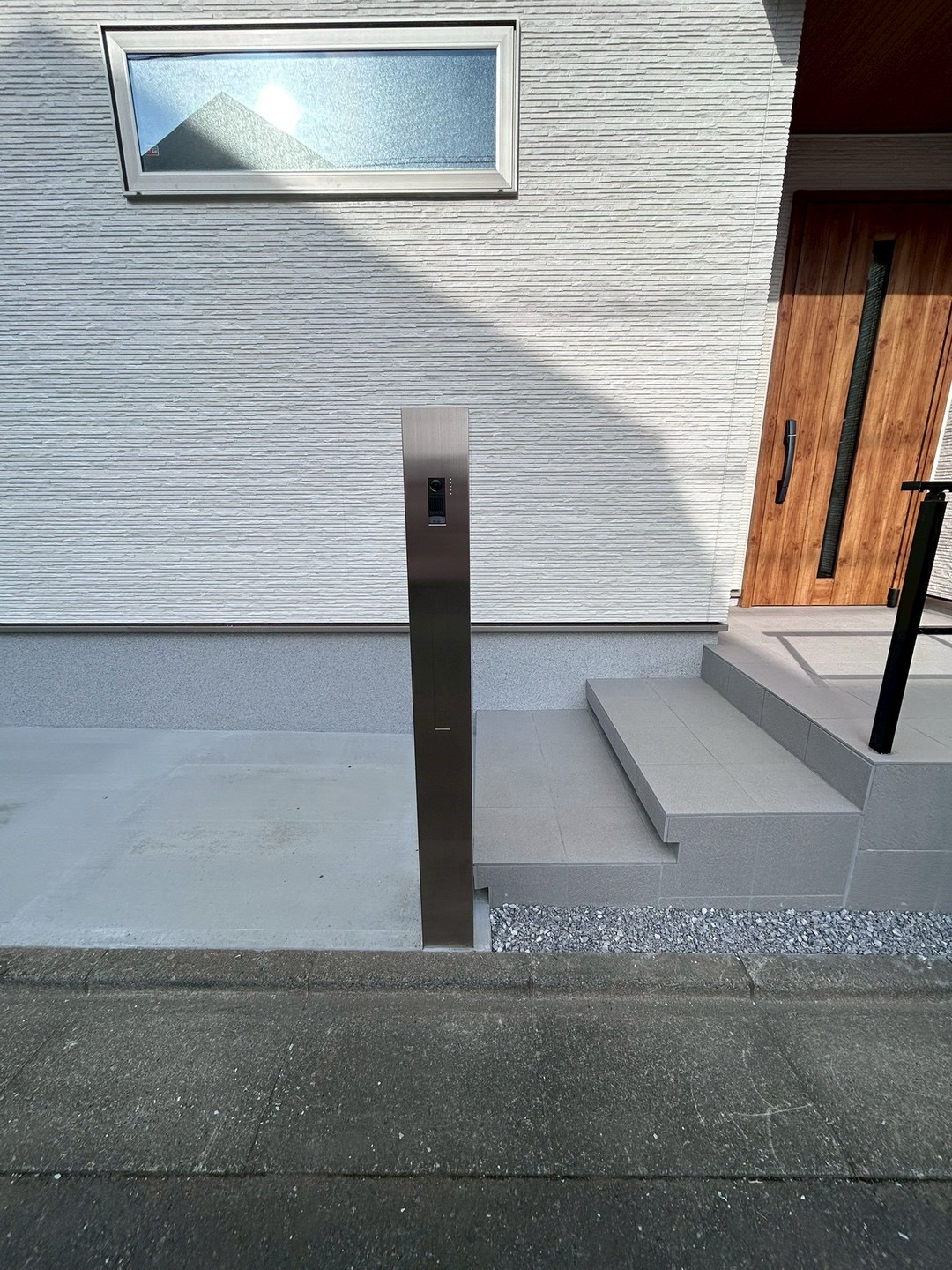 日中は、ステンレスの機能門柱と土間コンクリートが、