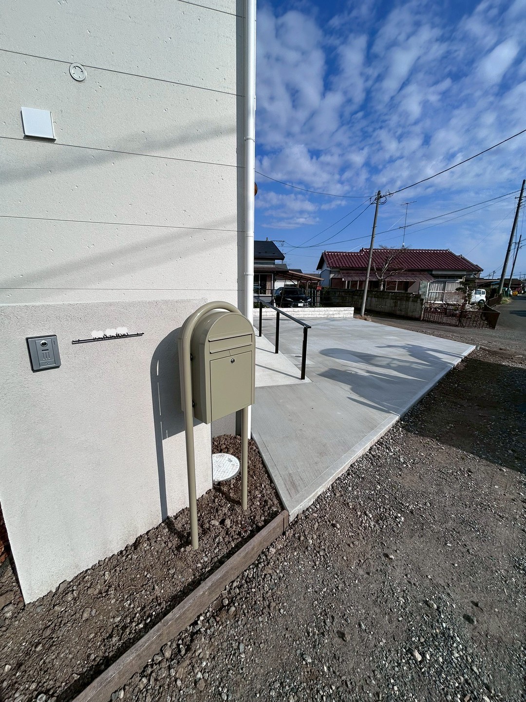 建物周りにはオリーブカラーのポストと白の門袖が洗練された印象を与え