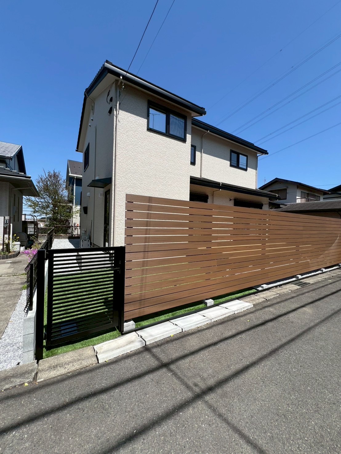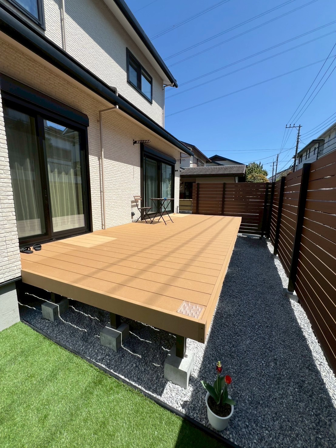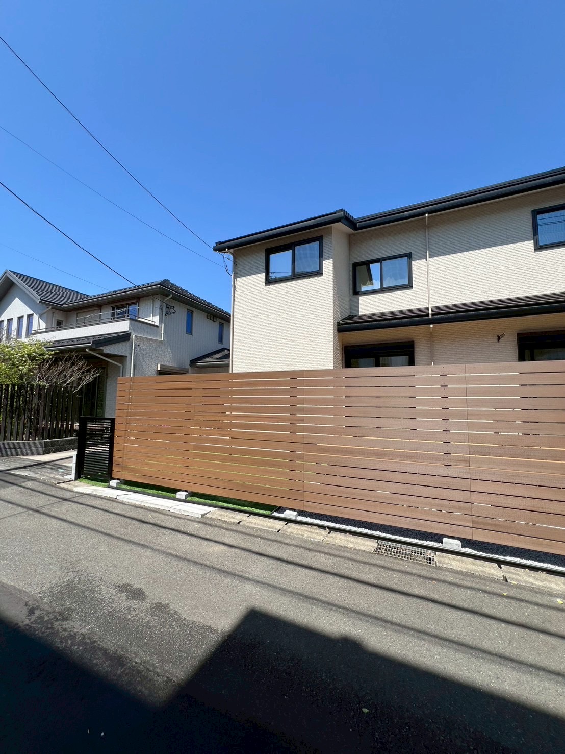 温かみのあるウッドデッキと、横に長い目隠しフェンスで