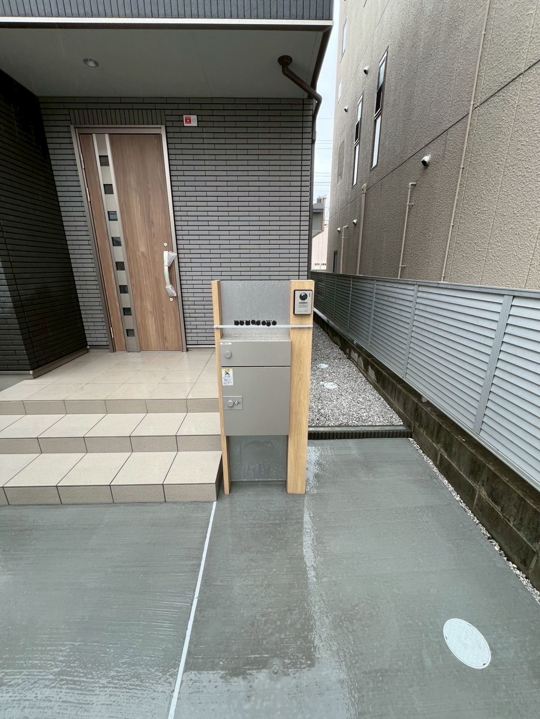 ナチュラルオークの温かみある色合いとプラチナステンの宅配ポストが特徴的です。