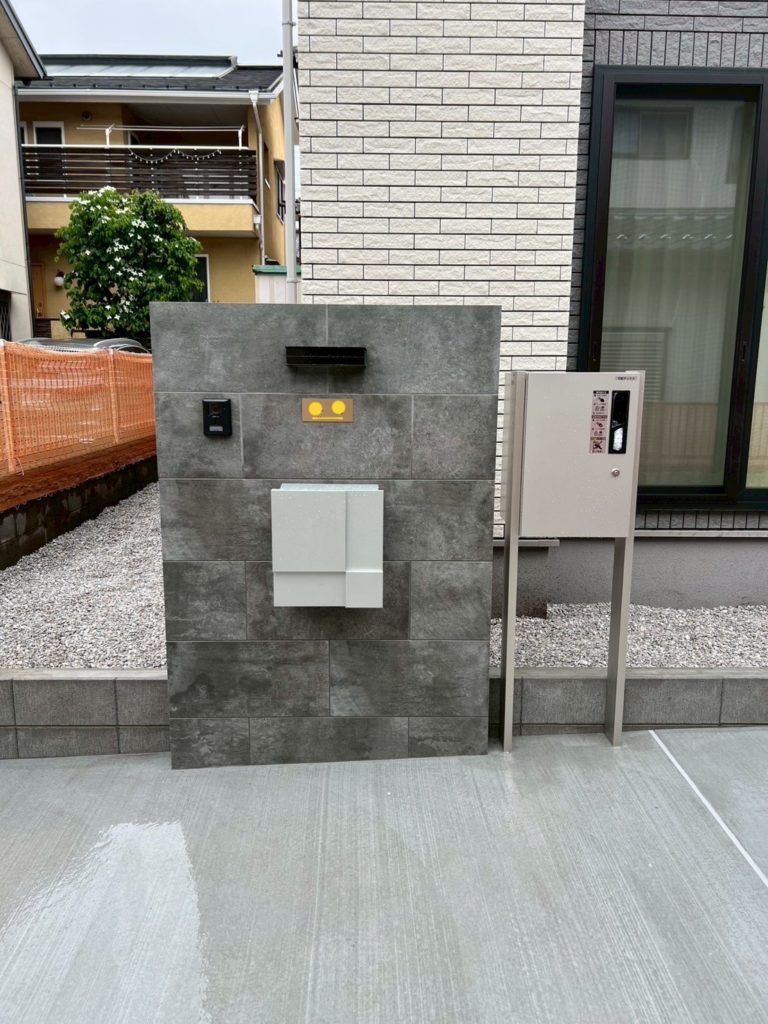 まとめた機能門柱を設置し便利な宅配ボックスも取り付けました。