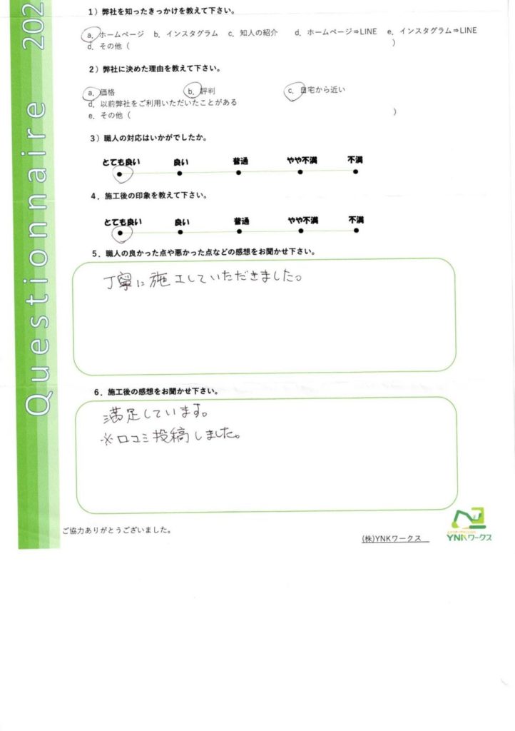 施工完了後のお客様にアンケートのご協力をいただきました♪