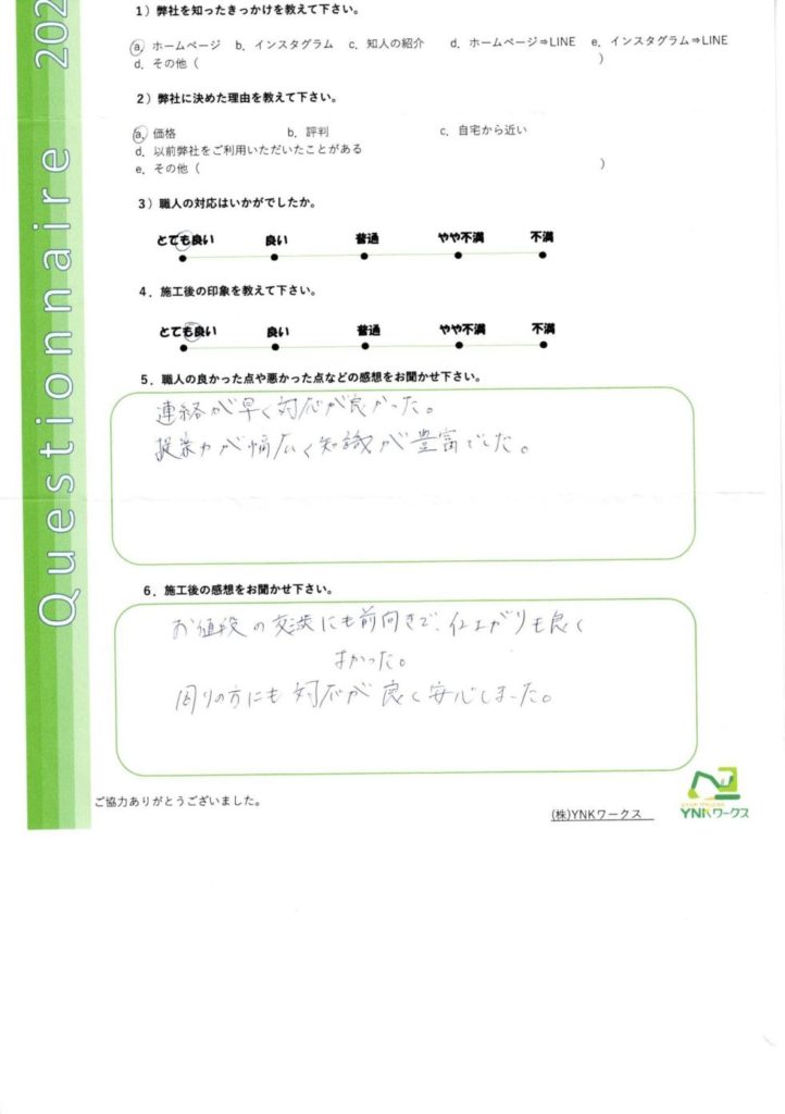 施工完了後のお客様にアンケートのご協力をいただきました♪