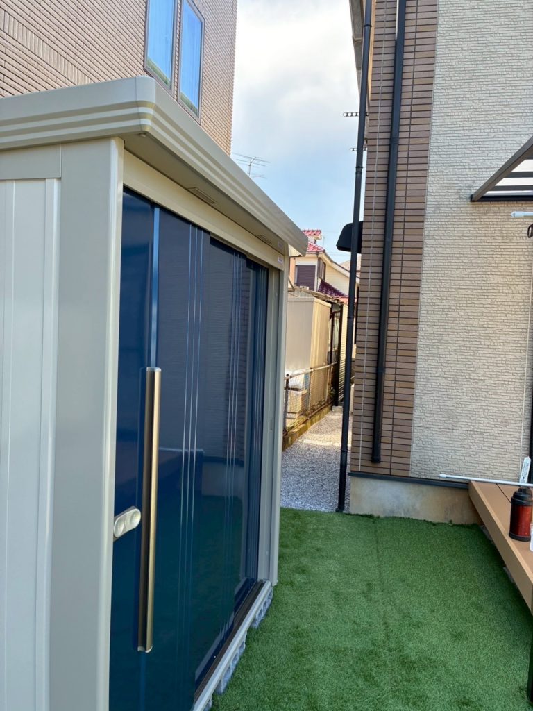 今回のポイントは、ディープブルーが美しいタクボ物置(ND-2008型)の設置💡