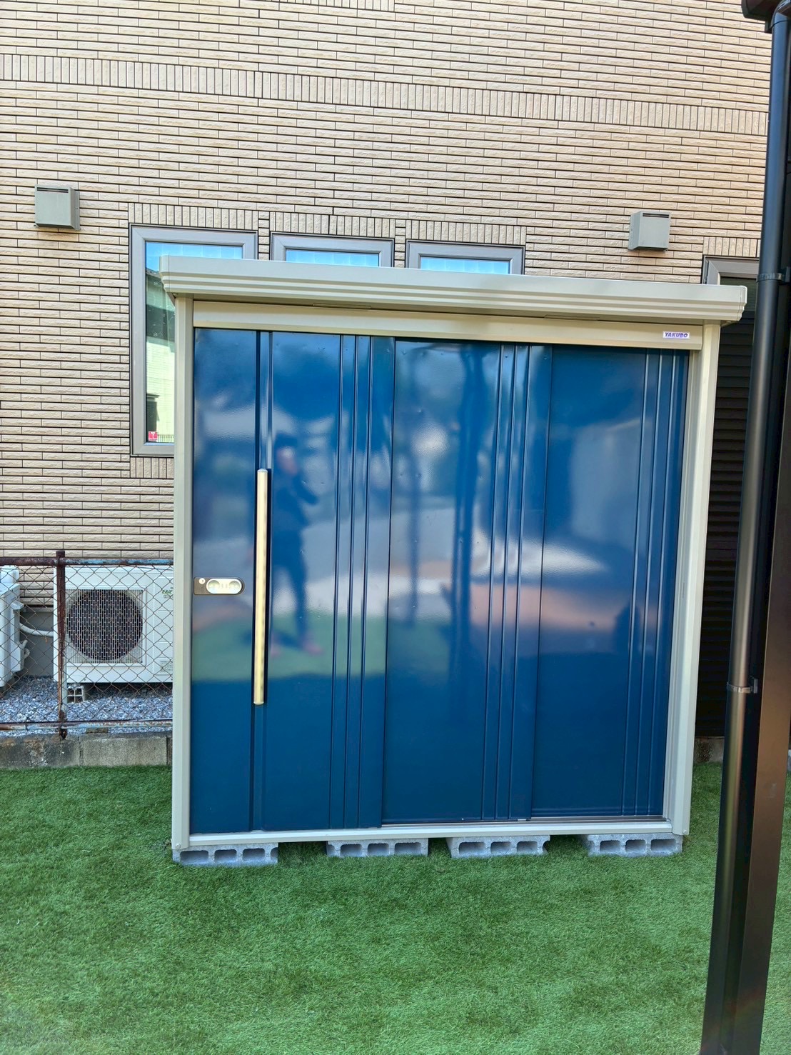 今回のポイントは、ディープブルーが美しいタクボ物置(ND-2008型)の設置💡