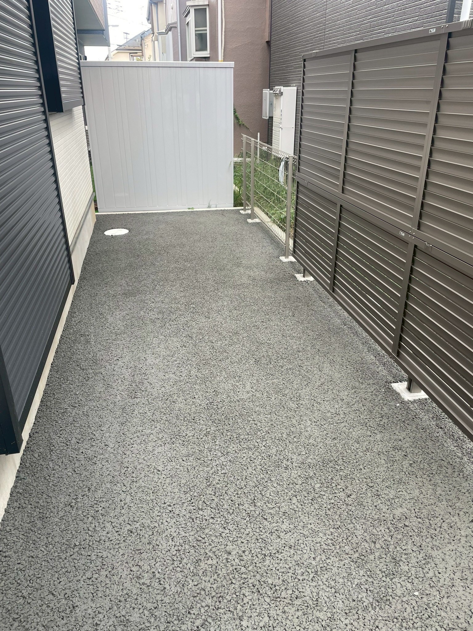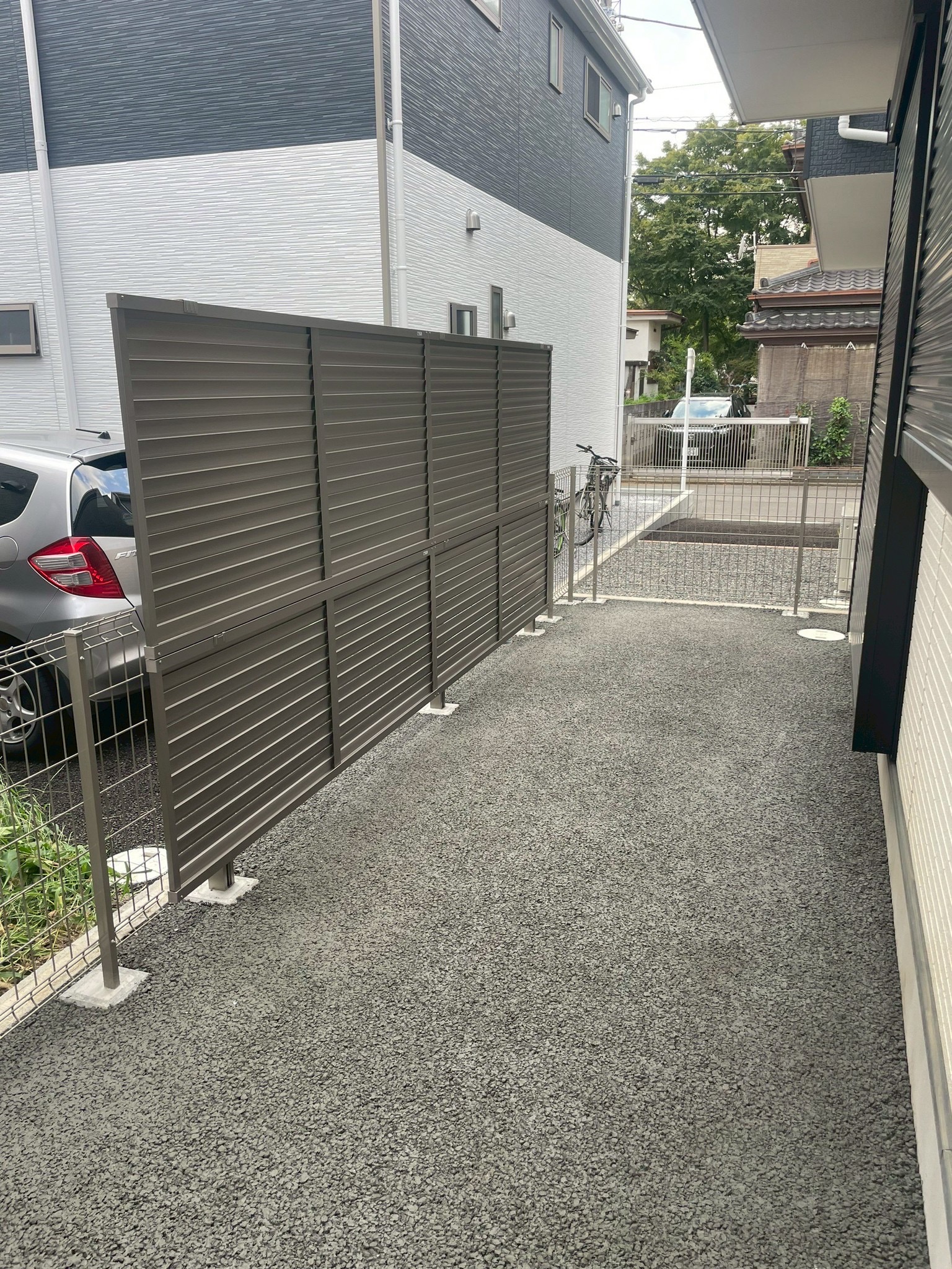 お隣の駐車場前には、シャイングレーの目隠しフェンスを設置し、視線をしっかりガード!
