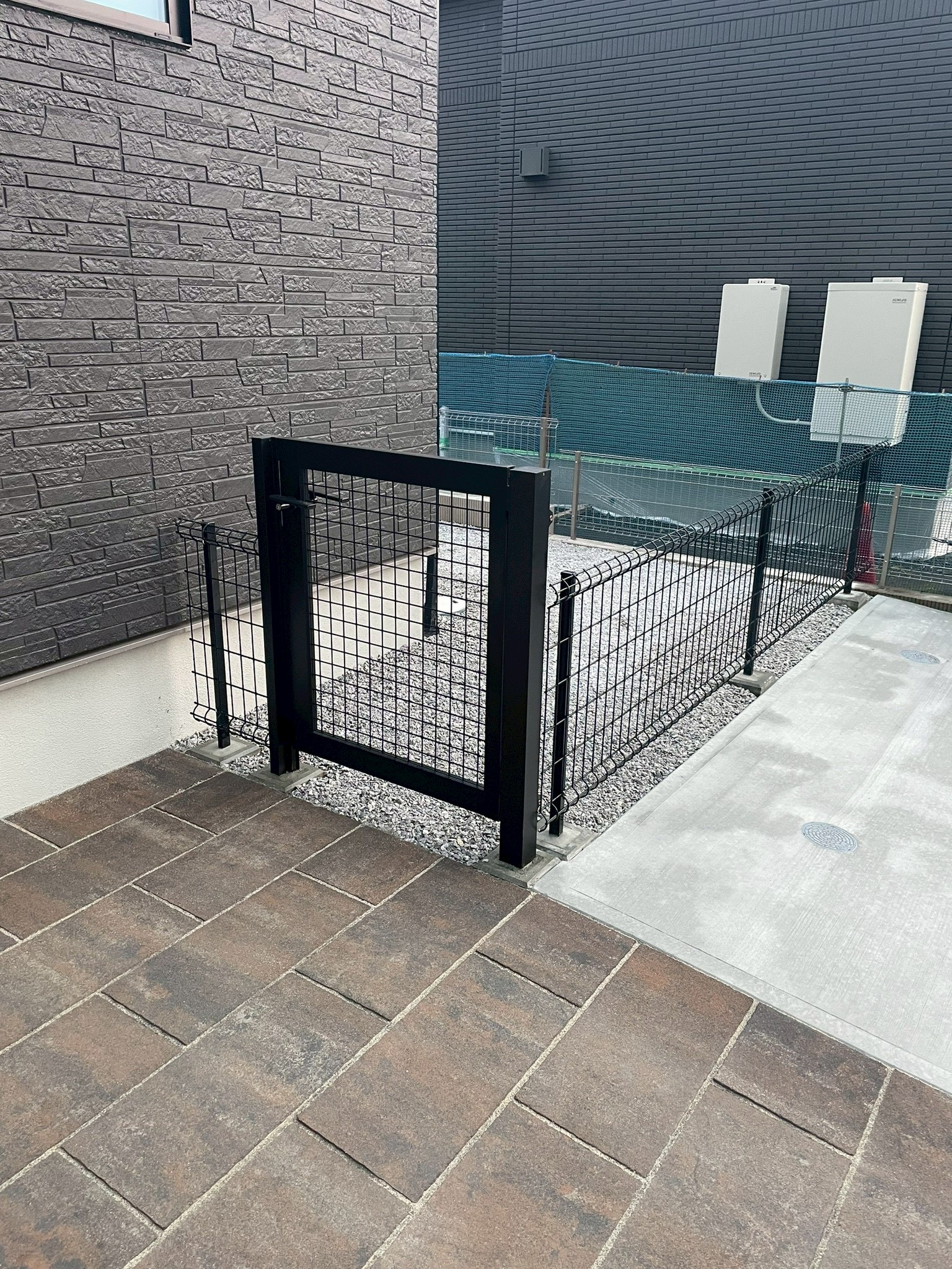 家周りはメッシュフェンスでぐるりと囲みアルメッシュ門扉も設置。
