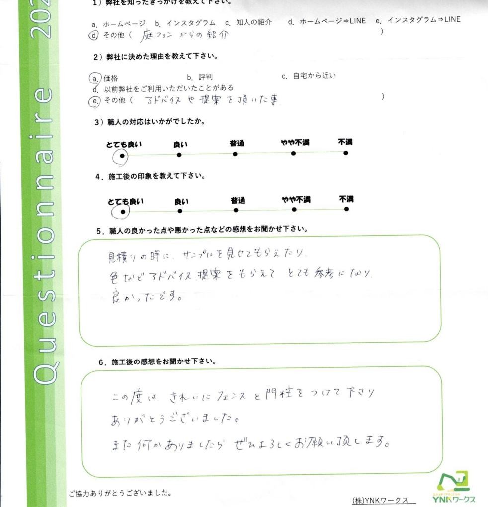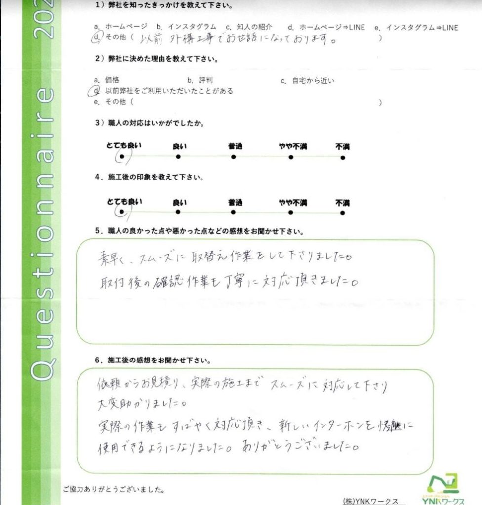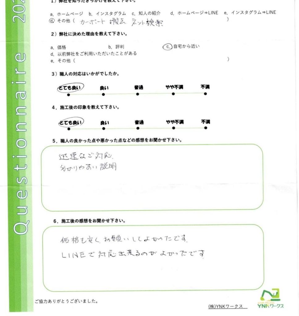施工完了後のお客様にアンケートのご協力をいただきました♪