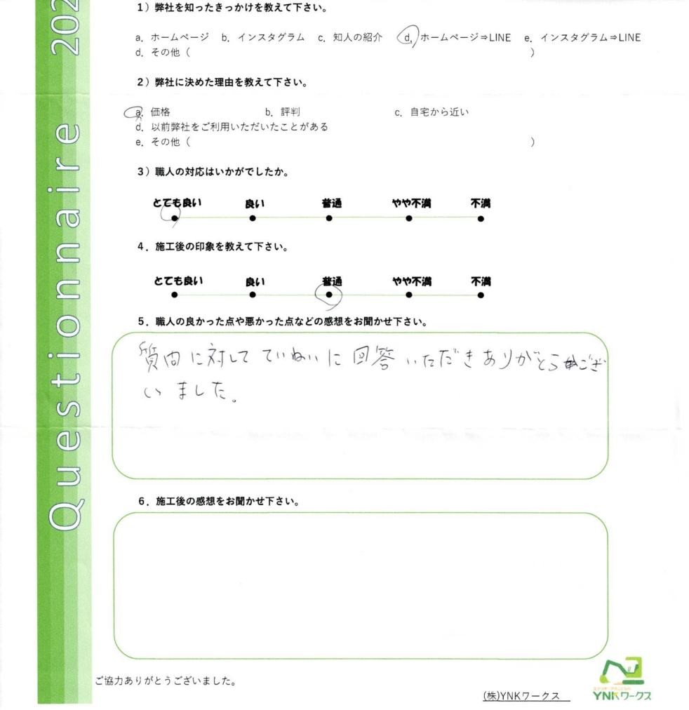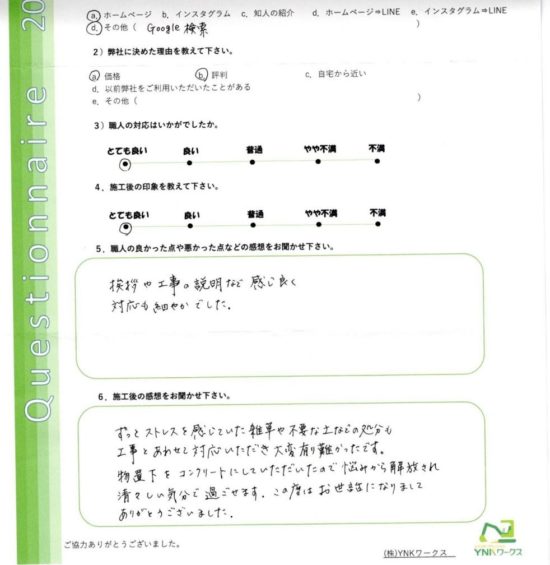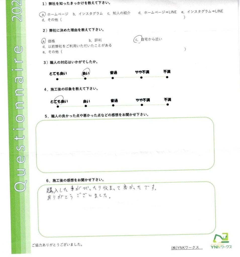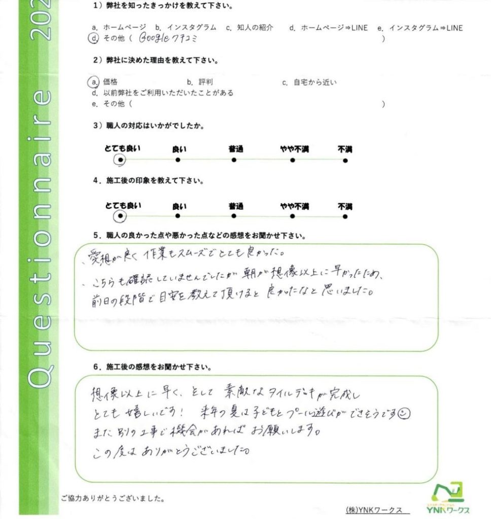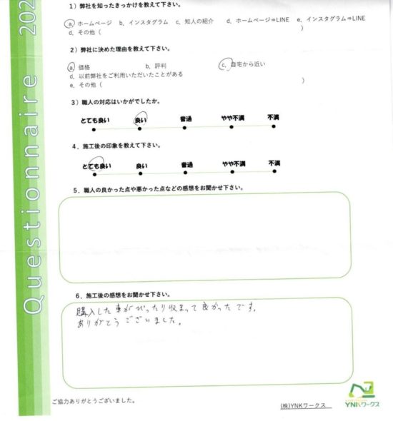 施工完了後のお客様にアンケートのご協力をいただきました♪
